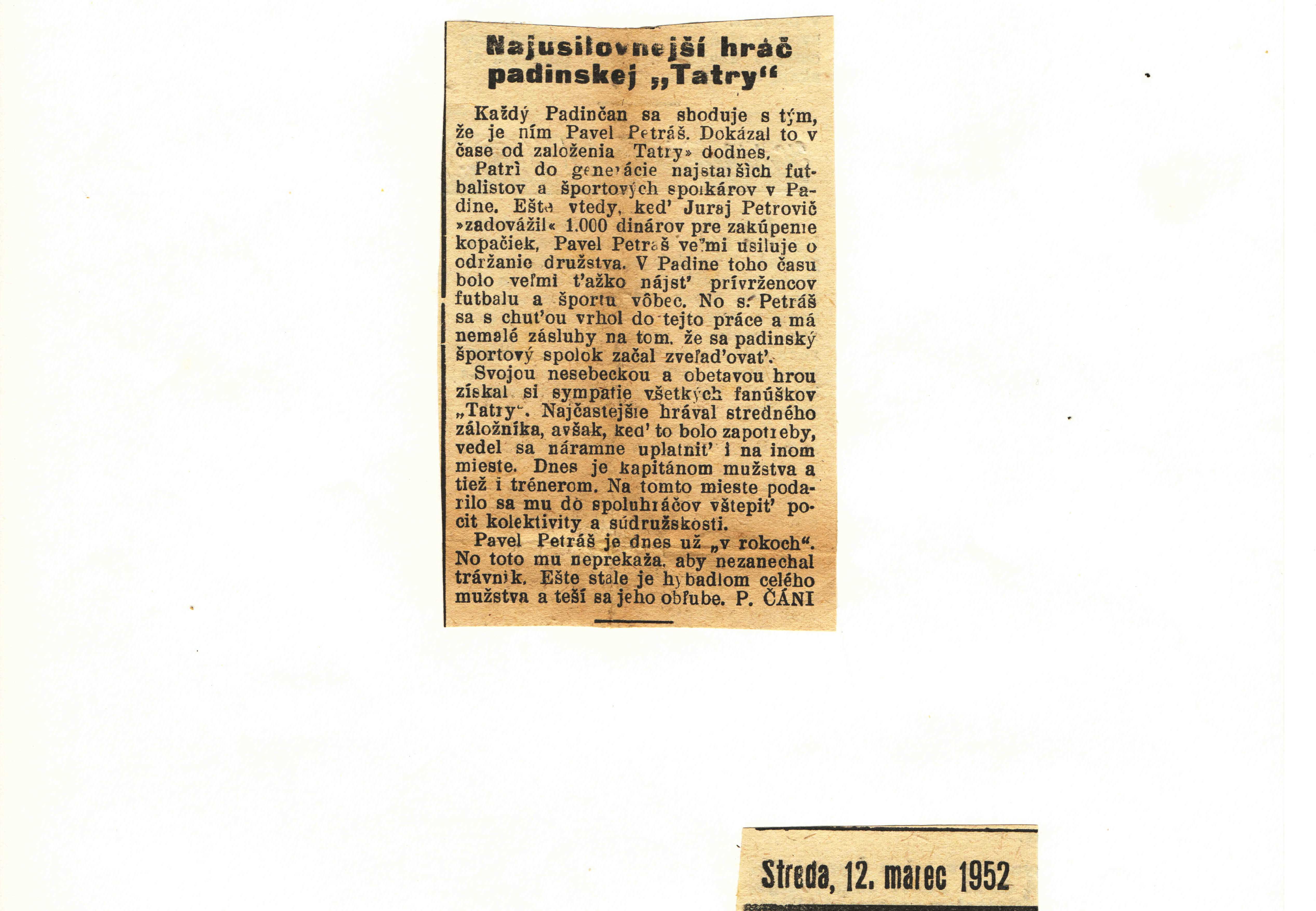 November 1954, priateľský zápas: TATRA Padina – JANOŠIK Janošik 5:6 (3:3)